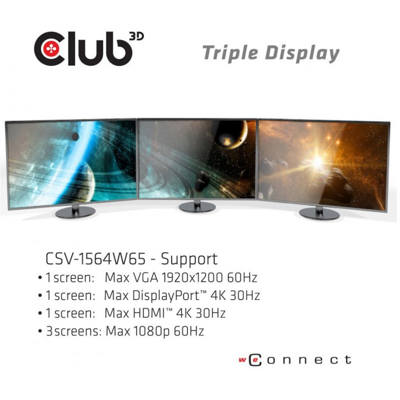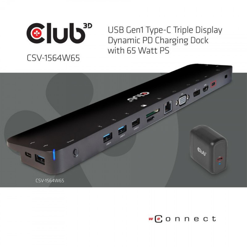 "CLUB3D UNIVERSAL USB Gen1 Type-C Triple Display Dynamic PD Charging Dock with 65 Watt PS ( VGA, HDMI, DP, ETHERNET). Connectivity technology: Docking, Host interface: USB 3.2 Gen 1 (3.1 Gen 1) Type-C, Headphone connectivity: 3.5 mm. Ethernet LAN data rates: 1000 Mbit/s, Copper ethernet cabling technology: 1000BASE-TX, Networking standards: IEEE 802.3. Product colour: Black, Compatible memory cards: MicroSD (TransFlash), HD type: 4K Ultra HD. Power source type: AC, Power connector: USB Type-C, Power supply: 100 W. Width: 350 mm, Depth: 75 mm, Height: 20 mm"\n"The Club 3D CSV-1564W65 USB Gen1 Type-C Triple Display Dynamic PD Charging Dock is an integrated solution combining Video, Data, Power, Ethernet and Audio especially for frequent travelers. The Three different Video ports (HDMI™, DisplayPort™, VGA) allow you to enjoy 3 different images or videos on 3 different displays simultaneously under MST mode. The USB Type-A ports and USB Type-C data port allow you to connect multiple USB devices to the host. The USB Type-C charging port allows you to provide power for this Dock and can charge the host PC at the same time by connecting a PD power Adapter, no need to carry your notebooks' power supply. So in general the user is traveling lighter. The Micro SD and SD/MMC ports allow you to read the information in the memory card onto the host. The 3.5mm audio port allows enjoying the music of the host via a headset. Besides, with the Gigabit Ethernet port, you can enjoy high speed Ethernet on the host. It supports all DP Alt mode supported hosts (PC, laptop, mobile phone, etc.), Dynamic Current Detection and Power Distribution, the product no longer intercepts the fixed power from the external PD Power Supply, but intercepts it according to the actual power consumed by itself, so that the PC can be dynamically charged more power. For Video Signal the source device needs to support DisplayPort™ Alt Mode.