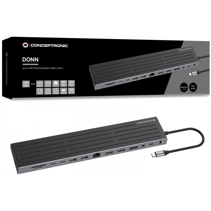 "Conceptronic DONN32B 14-in-1 MST Docking Station USB 3.2 Gen 1, HDMI x 2, DP, GbE LAN, USB-A 5Gbps x 3, USB-C 5Gbps x 2, SD, TF/MicroSD, 3.5mm headset, Security Slot, 100W USB PD. Connectivity technology: Wired, Host interface: USB 3.2 Gen 1 (3.1 Gen 1) Type-C, USB Power Delivery up to: 100 W. Ethernet LAN data rates: 10,100,1000 Mbit/s, Networking standards: IEEE 802.3ab. Product colour: Grey, Silver, Compatible memory cards: MicroSD (TransFlash), HD type: 4K Ultra HD. Power source type: USB, USB cable length: 0.18 m. Windows operating systems supported: Windows 10, Windows 10 Education, Windows 10 Education x64, Windows 10 Enterprise, Windows 10..., Mac operating systems supported: Mac OS X 10.10 Yosemite, Mac OS X 10.11 El Capitan, Mac OS X 10.12 Sierra, Mac OS X 10.13 High..., Mobile operating systems supported: Android 10.0, Android 11.0, Android 12.0, Android 13.0, Android 14.0, Android 5.0, Android 5.1,..."\n"Unlock full workstation potential with this high-performance 14-in-1 docking station. Designed for professionals who demand more, it supports triple extended displays on Windows via HDMI and DisplayPort with crisp 4K@60Hz resolution.