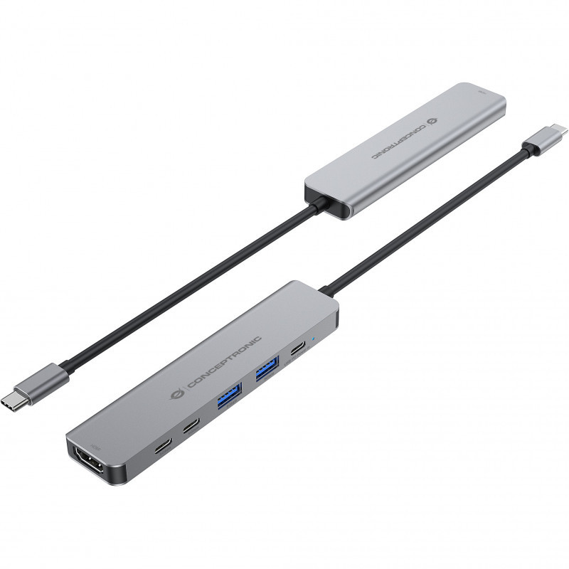 "Conceptronic DONN33G 6-in-1 USB 3.2 Gen 1 Docking Station, HDMI, USB-A 5Gbps x 2, USB-C 5Gbps x 2, 100W USB PD. Connectivity technology: Wired, Host interface: USB 3.2 Gen 1 (3.1 Gen 1) Type-C, USB Power Delivery up to: 100 W. Product colour: Silver, Data transfer rate: 5 Gbit/s, HD type: 4K Ultra HD. Power source type: USB, USB cable length: 0.25 m. Windows operating systems supported: Windows 10, Windows 10 Education, Windows 10 Education x64, Windows 10 Enterprise, Windows 10..., Mac operating systems supported: Mac OS X 10.10 Yosemite, Mac OS X 10.11 El Capitan, Mac OS X 10.12 Sierra, Mac OS X 10.13 High..., Mobile operating systems supported: Android 10.0, Android 11.0, Android 12.0, Android 13.0, Android 14.0, Android 5.0, Android 5.1,.... Width: 113.3 mm, Depth: 28 mm, Height: 10 mm"\n"Enhance your device’s USB-C capabilities with the 6-in-1 Docking Station, featuring HDMI, USB-C PD, USB-A (5Gbps), and USB-C (5Gbps) ports. Seamlessly connect USB-C-compatible laptops, tablets, or smartphones to an HDMI display and enjoy crisp 4K Ultra HD resolution at 30Hz. With data transfer speeds of up to 5Gbps, this docking station delivers reliable performance—perfect for streaming, presentations, multitasking, and everyday productivity."