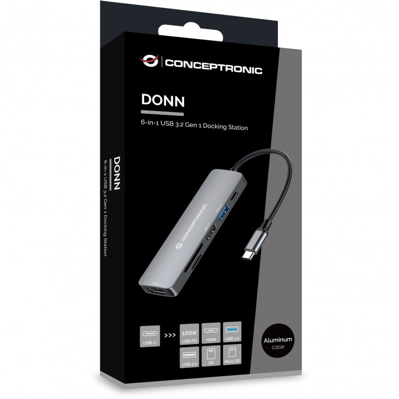 "Conceptronic DONN11G 6-in-1 USB 3.2 Gen 1 Docking Station, HDMI, 100W USB PD, USB 3.0, USB 2.0, SD, TF/MicroSD. Connectivity technology: Wired, Host interface: USB 3.2 Gen 1 (3.1 Gen 1) Type-C, USB Power Delivery up to: 100 W. Product colour: Grey, Compatible memory cards: MicroSD (TransFlash), SD, Data transfer rate: 5 Gbit/s. Power source type: USB, USB cable length: 0.12 m. Windows operating systems supported: Windows 10, Windows 10 Education, Windows 10 Education x64, Windows 10 Enterprise, Windows 10..., Mac operating systems supported: Mac OS X 10.10 Yosemite, Mac OS X 10.11 El Capitan, Mac OS X 10.12 Sierra, Mac OS X 10.13 High..., Mobile operating systems supported: Android 10.0, Android 11.0, Android 12.0, Android 5.0, Android 5.1, Android 6.0, Android 7.0,.... Width: 30.2 mm, Depth: 107.6 mm, Height: 10.7 mm"\n"This 6-in-1 USB 3.2 Gen 1 Docking Station makes it possible to expand your device’s USB Type-C capacity with HDMI/USB-C PD/USB 3.0/USB 2.0 ports and card readers (SD, MicroSD/TF).
