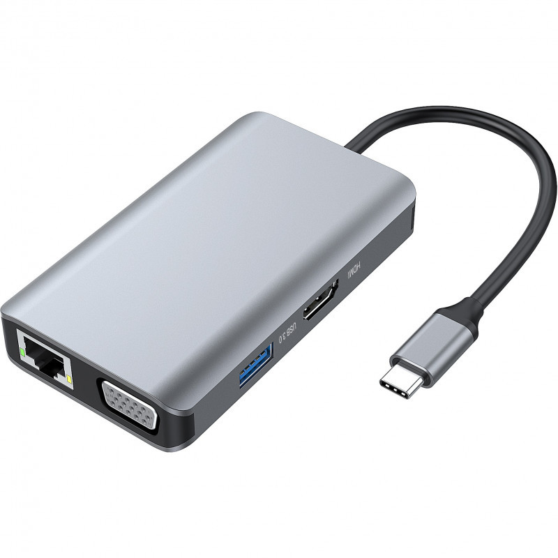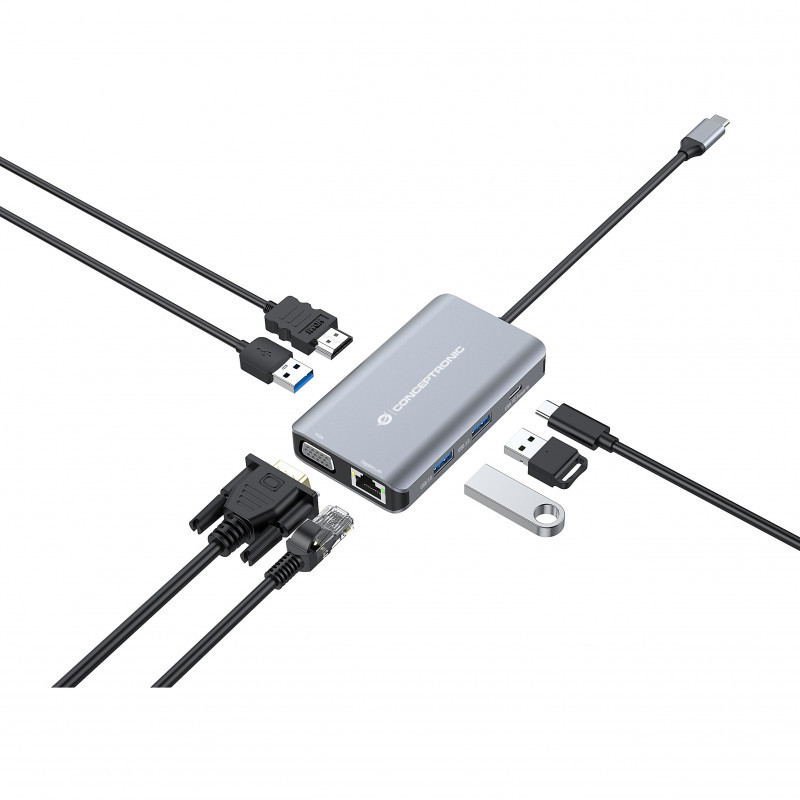 "Conceptronic DONN21G. Connectivity technology: Wired, Host interface: USB 3.2 Gen 1 (3.1 Gen 1) Type-C, USB Power Delivery up to: 100 W. Ethernet LAN data rates: 1000 Mbit/s. Product colour: Grey, HD type: 4K Ultra HD, Maximum digital resolution: 3840 x 2160 pixels. Power cable length: 0.2 m. Windows operating systems supported: Windows 10, Windows 11, Windows 7, Windows 8, Windows Vista, Windows XP, Mac operating systems supported: Mac OS X 10.10 Yosemite, Mac OS X 10.11 El Capitan, Mac OS X 10.12 Sierra, Mac OS X 10.13 High..., Other operating systems supported: Android, ChromeOS"\n"This 7-in-1 Docking Station makes it possible to expand your device’s USB Type-C capacity with HDMI/VGA/USB-C PD/USB 3.0/GbE ports. The docking station provides an easy way to add HDTV, or equipment such as a monitor or projector to any USB-C device such as a smartphone, portable gaming console, MacBook, Chromebook Pixel or any similar late-model laptop with USB-C ports. The multiport video adapter lets you mirror or extend content on two additional monitors simultaneously (1 x HDMI, 1 x VGA), creating a dual-screen workstation. Perfect for home entertainment, office presentations and classroom teaching."