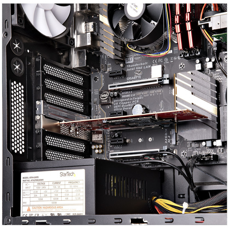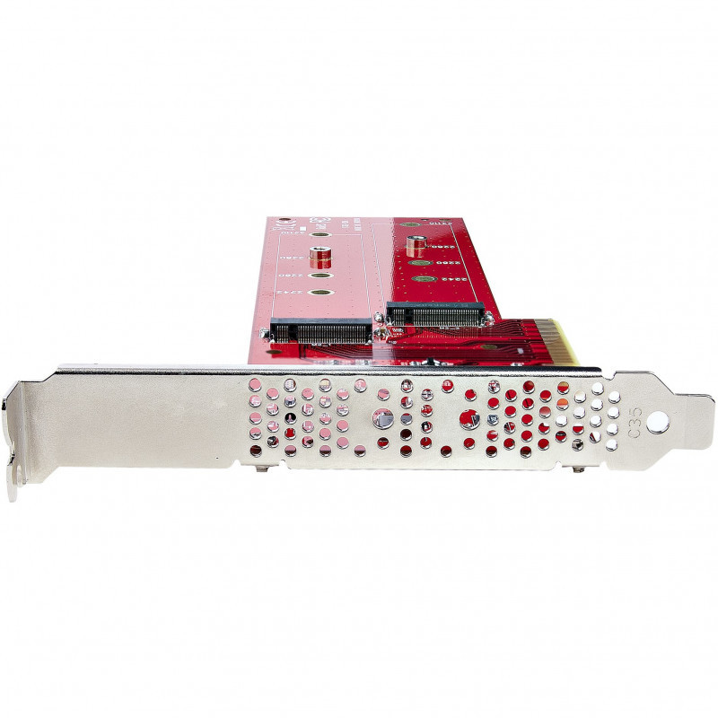 "StarTech.com Dual M.2 PCIe SSD Adapter Card, PCIe x8 / x16 to Dual NVMe or AHCI M.2 SSDs, PCI Express 4.0, 7.8GBps/Drive, Bifurcation Required - Windows/Linux Compatible. Host interface: PCIe, Output interface: M.2, Expansion card standard: PCIe 4.0. Product colour: Red, Mean time between failures (MTBF): 6493014 h. Data transfer rate (max): 7.8 Gbit/s. Supported storage drive heights: 22 mm. Width: 102 mm, Depth: 228 mm, Height: 22 mm"\n"Dual M.2 NVMe / AHCI | PCIe 4.0 x8 or x16 Slot | Bifurcation