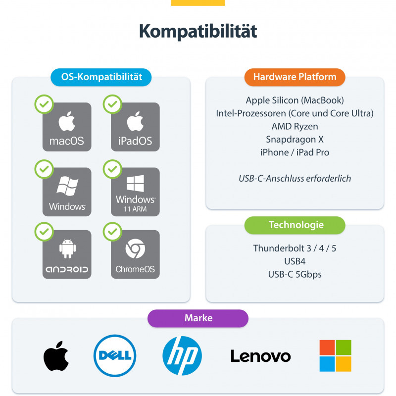 Enjoy plug-and-play functionality across a broad range of USB-C and Thunderbolt devices including laptops, tablets, and even USB-C-enabled phones. It works reliably across all major operating systems including Windows, macOS, iPadOS, iOS, Android, and Chrome OS.