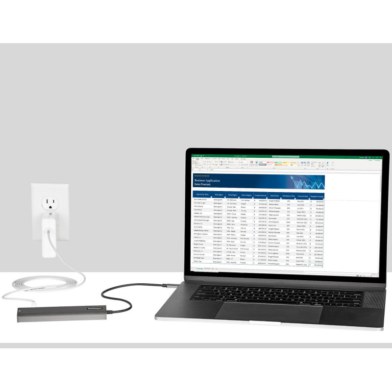 "StarTech.com USB-C Multiport Adapter Hub, USB-C to 4K 60Hz HDMI, Gigabit Ethernet and 100W Laptop Charging for Macbook Pro / Air and Windows. Connectivity technology: Wired, Host interface: USB 3.2 Gen 1 (3.1 Gen 1) Type-C, USB Power Delivery up to: 100 W. Ethernet LAN data rates: 10,100,1000 Mbit/s. Product colour: Black, Grey, Compatible memory cards: MMC, MicroSD (TransFlash), SD, Data transfer rate: 5 Gbit/s. Power consumption (max): 12 W. Windows operating systems supported: Windows 10, Windows 10 Education, Windows 10 Education x64, Windows 10 Enterprise, Windows 10..., Mac operating systems supported: Mac OS X 10.13 High Sierra, Mac OS X 10.14 Mojave, Mac OS X 10.15 Catalina, Mac OS X 10.15.3..., Mobile operating systems supported: Android, iPadOS"\n"4K 60Hz HDMI, 2x USB 5Gbps, GbE, SD/microSD, and 100W Power Delivery Pass-Through, all from one USB-C connection