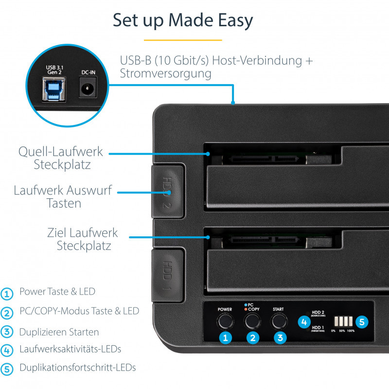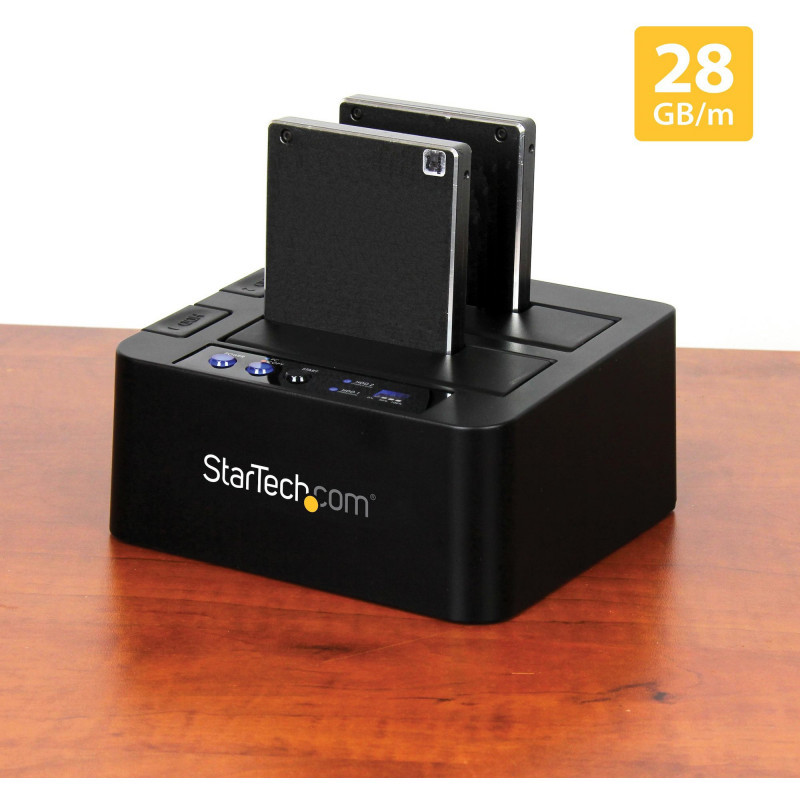 "StarTech.com Standalone Hard Drive Duplicator, Dual Bay HDD/SSD Cloner/Copier, USB 3.1 (10Gbps) to SATA III HDD/SSD Docking Station, Hard Disk Duplicator Dock, Hard Drive Cloner. Product type: HDD duplicator, Number of simultaneous copies: 2 copies, Interface: USB 3.1. Supported HDD sizes: 2.5,3.5"", Supported HDD interfaces: Serial ATA, Serial ATA II, Serial ATA III. Power consumption (typical): 36 W, AC input voltage: 100-240 V, Input current: 1.5 A. Dimensions (WxDxH): 132 x 142 x 70 mm, Weight: 508 g. Package width: 300 mm, Package depth: 166 mm, Package height: 88 mm"\n"Hard Drive Cloner | 2.5""/3.5"" HDD/SSD | USB 3.2 Gen 2 (10 Gbps) to SATA III