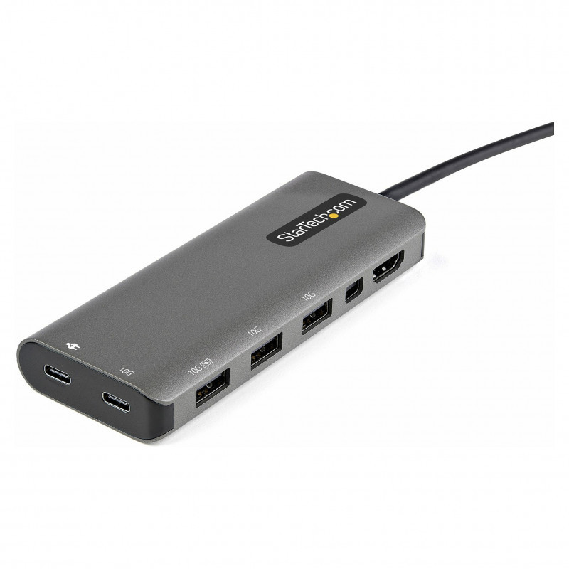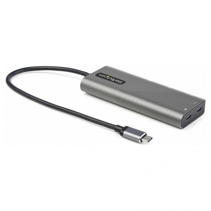 "StarTech.com USB C Multiport Adapter - USB-C to HDMI or Mini DisplayPort 4K 60Hz, 100W Power Delivery Pass-Through, 4-Port 10Gbps USB Hub - USB Type-C Mini Dock - w/ 12"" Attached Cable. Connectivity technology: Wired, Host interface: USB 3.2 Gen 1 (3.1 Gen 1) Type-C, USB Power Delivery up to: 100 W. Product colour: Black, Silver, Data transfer rate: 10 Gbit/s, HD type: 4K Ultra HD. Power consumption (typical): 15 W. Windows operating systems supported: Windows 10, Windows 10 Education, Windows 10 Education x64, Windows 10 Enterprise, Windows 10..., Mac operating systems supported: Mac OS X 10.13 High Sierra, Mac OS X 10.14 Mojave, Mac OS X 10.15 Catalina, Mac OS X 10.15.3..., Linux operating systems supported: Ubuntu 18.04 LTS, Ubuntu 20.04 LTS. Width: 425 mm, Depth: 46.8 mm, Height: 160 mm"\n"USB-C Multiport Adapter | HDMI & Mini DisplayPort Video | 100W PD Pass-Through | 4-Port USB Hub