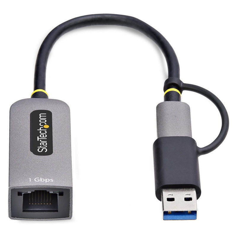 "StarTech.com USB-C to Ethernet Adapter with USB-A Dongle, 10/100/1000Mbps, USB 3.0 to Gigabit Ethernet Network Adapter, 6in/15cm Attached Cable, USB GbE Adapter. Connectivity technology: Wired, Host interface: USB Type-A/USB Type-C, Interface: Ethernet. Maximum data transfer rate: 5000 Mbit/s. USB powered. Product colour: Grey"\n"Add Gigabit Ethernet network connectivity to a Laptop or Desktop through a USB Type-C or A port