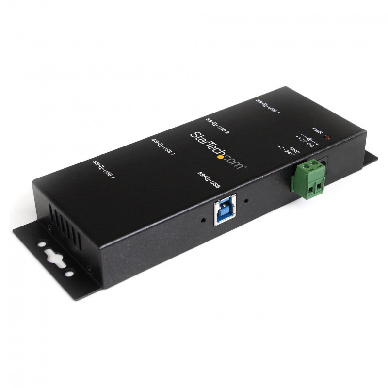 "StarTech.com 4-Port Industrial USB 3.0 Hub with ESD Protection~4-Port USB 3.0 Hub - 5Gbps - Metal Industrial USB-A Hub - Wall or Desk Mountable USB Data Hub - TAA Compliant USB Expander Hub. Host interface: USB 3.2 Gen 1 (3.1 Gen 1) Type-B, Hub interfaces: USB 3.2 Gen 1 (3.1 Gen 1) Type-A. Data transfer rate: 5000 Mbit/s, Product colour: Black, Housing material: Steel. Power consumption (typical): 36 W, Output voltage: 12 V, Output current: 3 A. Windows operating systems supported: Windows 10 Education, Windows 10 Education x64, Windows 10 Enterprise, Windows 10 Enterprise x64,..., Mac operating systems supported: Mac OS X 10.4 Tiger, Mac OS X 10.5 Leopard, Mac OS X 10.6 Snow Leopard. Width: 59.6 mm, Depth: 152 mm, Height: 24 mm"\n"Industrial-grade | 8kV Air | 4kV Contact | Metal | Mountable | 5 Gbps