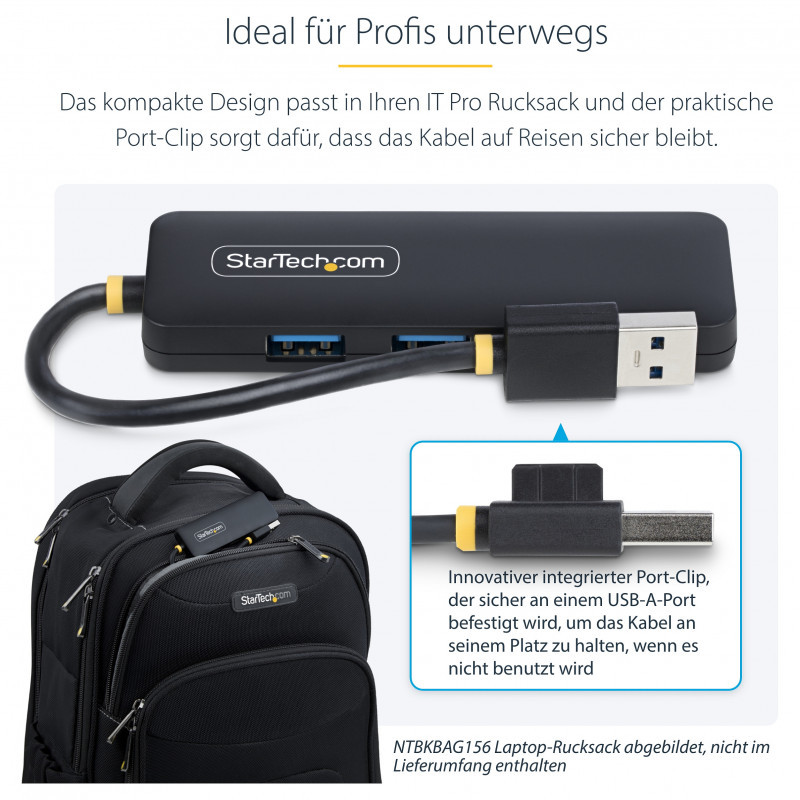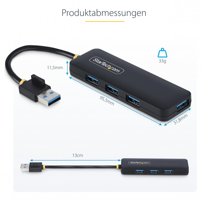 "StarTech.com 4-Port USB-A Hub, 5Gbps, Bus Powered, Small Travel Mini USB Hub, Multi-Port USB 3.0 Splitter, Portable USB Hub, Overcurrent Protection (OCP). Host interface: USB 3.2 Gen 1 (3.1 Gen 1) Type-A, Hub interfaces: USB 3.2 Gen 1 (3.1 Gen 1) Type-A. Data transfer rate: 5000 Mbit/s, Product colour: Black, Housing material: Plastic. Power supply type: USB, Input voltage: 5 V, Output voltage: 5 V. Width: 31.8 mm, Depth: 95.5 mm, Height: 11.5 mm. Quantity per pack: 1 pc(s), Package width: 128 mm, Package depth: 31 mm"\n"Add four external USB 3.0 ports to your notebook or Ultrabook™ with a slim, portable hub