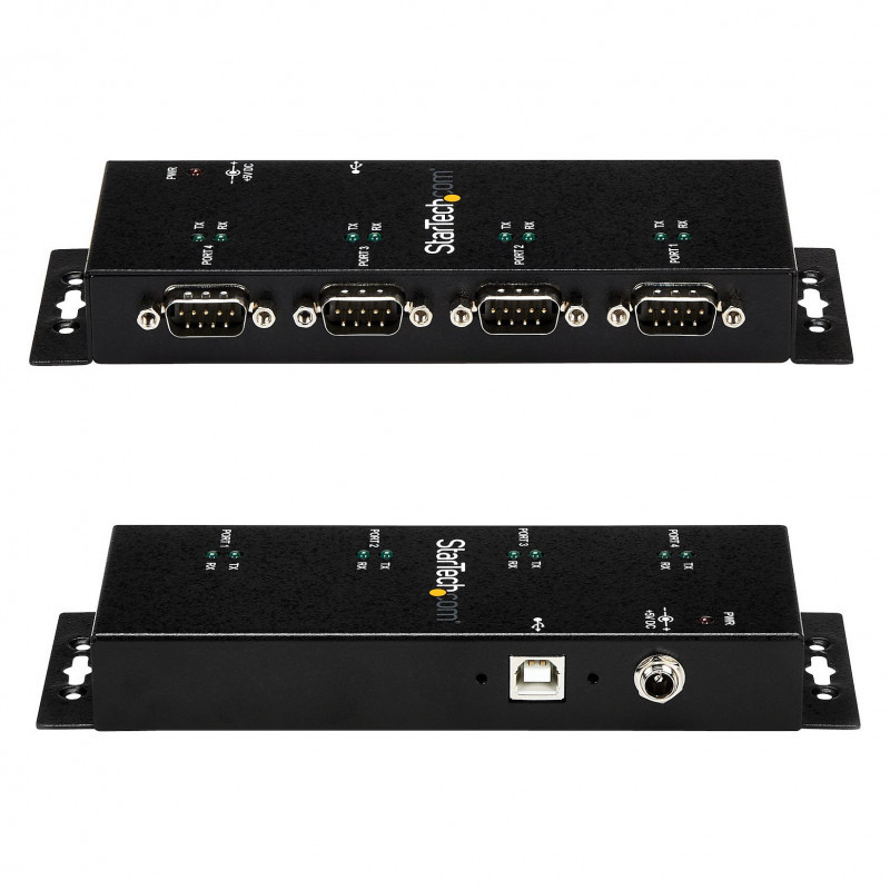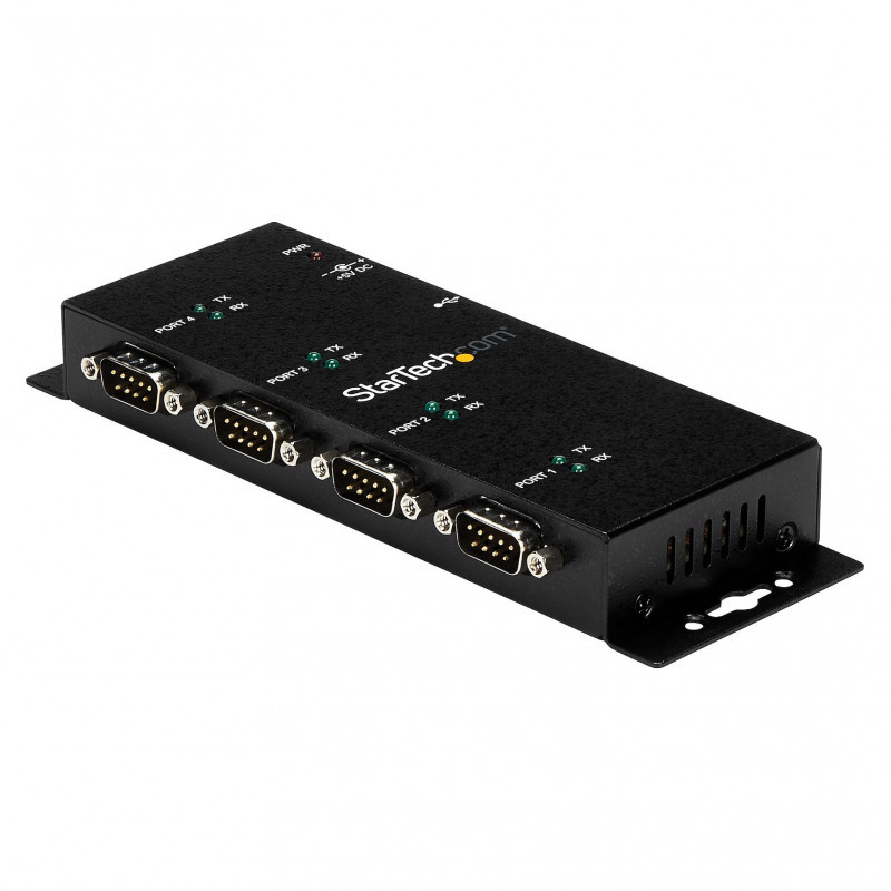 "StarTech.com 4 Port USB to DB9 RS232 Serial Adapter Hub – Industrial DIN Rail and Wall Mountable. Host interface: USB 2.0 Type-B, Hub interfaces: Serial. Product colour: Black, Housing material: Steel, LED indicators: Activity. Power source type: USB, Power plug type: Type M. Windows operating systems supported: Windows 10, Windows 10 Education, Windows 10 Education x64, Windows 10 Enterprise, Windows 10..., Mac operating systems supported: Mac OS X 10.10 Yosemite, Mac OS X 10.11 El Capitan, Mac OS X 10.12 Sierra, Mac OS X 10.13 High..., Server operating systems supported: Windows Server 2003, Windows Server 2008 R2, Windows Server 2012, Windows Server 2012 R2, Windows.... Width: 59 mm, Depth: 1788 mm, Height: 23 mm"\n"Add 4 DIN Rail-mountable RS232 Serial ports to any system through USB