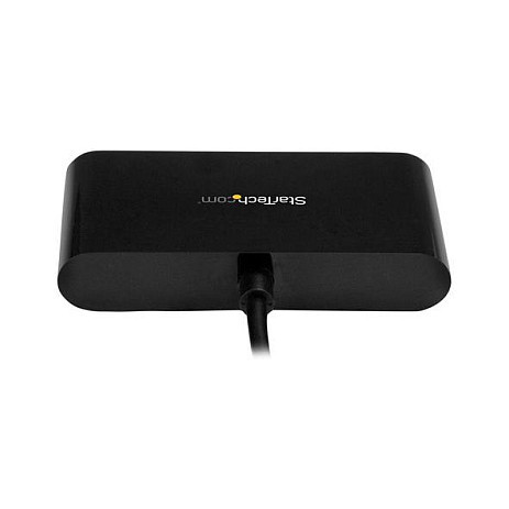 "StarTech.com 4-Port USB-C Hub - Mini Hub - USB-C to 4x USB-A - USB 2.0. Host interface: USB 2.0 Type-C, Hub interfaces: USB 2.0. Data transfer rate: 480 Mbit/s, Product colour: Black, Housing material: Plastic. Power source type: USB. Width: 80 mm, Depth: 185 mm, Height: 14 mm. Package width: 142 mm, Package depth: 170 mm, Package height: 30 mm"\n"This portable USB hub expands your laptop or desktop connectivity by adding four USB 2.0 (Type-A) ports through a single USB Type-C™ or Thunderbolt™ 3 port. And, because it’s USB bus-powered, you don’t need to connect an external power adapter, which makes travel more convenient and workstations less cluttered.