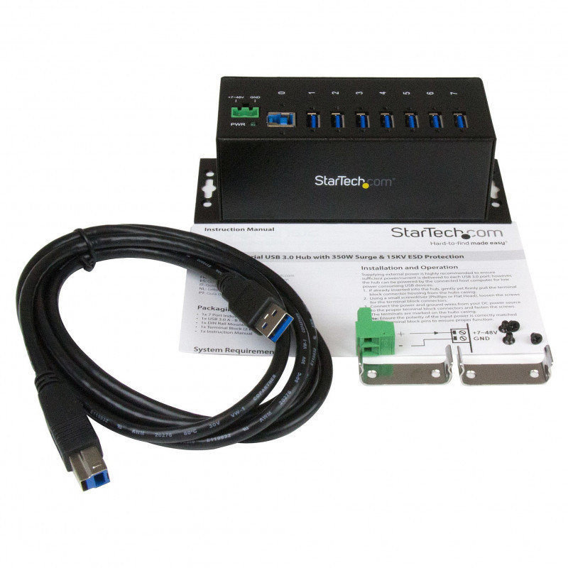 "StarTech.com 7-Port Industrial USB 3.0 Hub with ESD Protection~7-Port USB 3.0 Hub (5Gbps) - Metal Industrial USB-A Hub with ESD Protection & 350W Surge Protection - Din Rail, Wall or Desk Mountable - TAA Compliant USB Expander Hub. Host interface: USB 3.2 Gen 1 (3.1 Gen 1) Type-B, Hub interfaces: USB 3.2 Gen 1 (3.1 Gen 1) Type-A. Data transfer rate: 5000 Mbit/s, Product colour: Black, Housing material: Steel. Power source type: DC, Input voltage: 7 - 48 V. Width: 54 mm, Depth: 145 mm, Height: 45 mm. Package width: 295 mm, Package depth: 190 mm, Package height: 69 mm"\n"Industrial-grade | 15kV Air | 8kV Contact | Metal | Mountable | DIN Rail | 5 Gbps