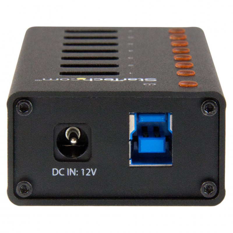 "StarTech.com 7-Port USB 3.0 Hub - Desktop or Wall-Mountable Metal Enclosure~7-Port USB 3.0 Hub (5Gbps) - Desktop or Wall-Mountable Metal Enclosure. Host interface: USB 3.2 Gen 1 (3.1 Gen 1) Type-B, Hub interfaces: USB 3.2 Gen 1 (3.1 Gen 1) Type-A. Data transfer rate: 5000 Mbit/s, Product colour: Black, Housing material: Aluminium. Power supply type: DC, Power consumption (max): 36 W, Input voltage: 100 - 240 V. Width: 44 mm, Depth: 110 mm, Height: 24 mm. Package width: 105 mm, Package depth: 169 mm, Package height: 104 mm"\n"Connect 7 high-performance devices to your computer or Mac with this compact and rugged hub