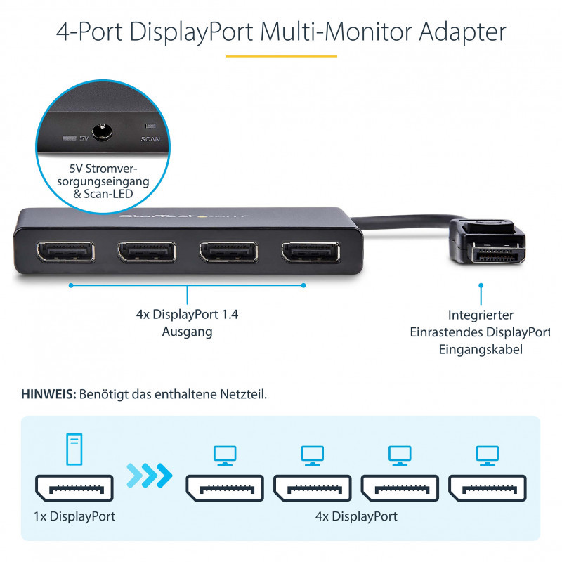 "StarTech.com 4-Port Multi Monitor Adapter - DisplayPort 1.2 MST Hub - 4x 1080p - DisplayPort Video Splitter for Extended Desktop Mode on Windows PCs Only - DP to Quad DP Monitors. Video port type: DisplayPort, Video out: 4x DisplayPort. Maximum resolution: 3840 x 2160 pixels, Product colour: Black, Housing material: Plastic. AC input voltage: 110 - 240 V, Input current: 0.5 A, Output voltage: 5 V. Width: 65 mm, Depth: 386 mm, Height: 15 mm. Package width: 241 mm, Package depth: 152 mm, Package height: 64 mm"\n"Use this adapter to connect four independent displays to a single DP 1.2 port
