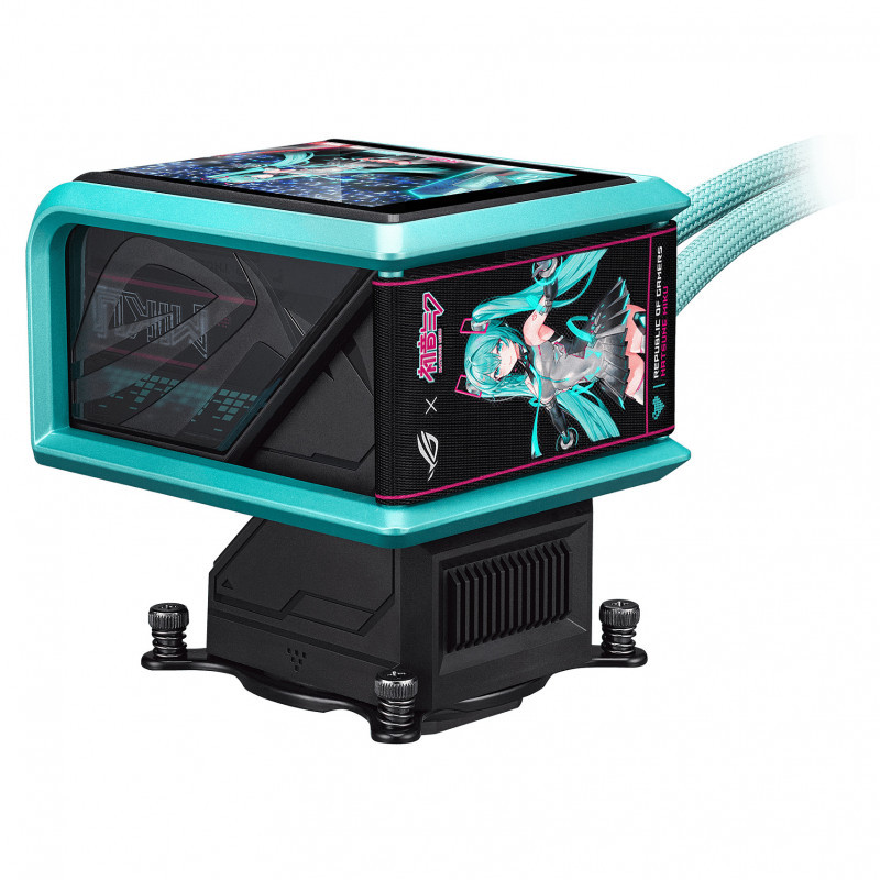 "ASUS ROG RYUO IV 360 ARGB Hatsune Miku Edition. Type: All-in-one liquid cooler, Fan diameter: 12 cm. Product colour: Black, Turquoise"\n"Feel the Beat, In-Game Feats