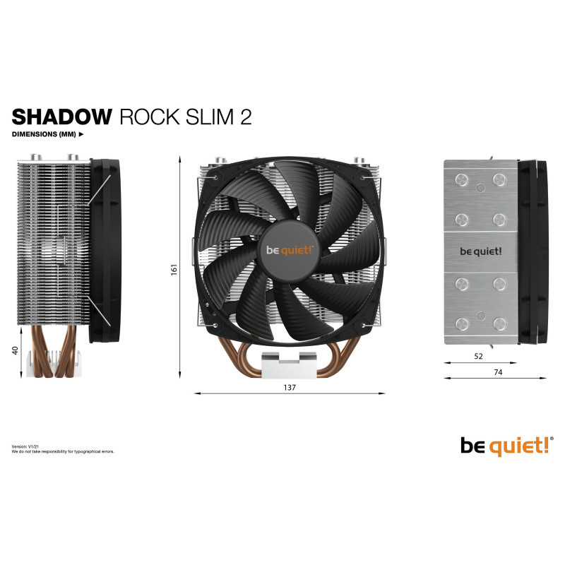 "be quiet! Shadow Rock Slim 2 CPU Cooler. Type: Cooler, Fan diameter: 13.5 cm, Rotational speed (max): 1400 RPM, Bearing type: Rifle bearing. Width: 137 mm, Depth: 74 mm, Height: 161 mm. Product colour: Aluminium, Black, Copper"\n"COMPACT COOLING, SIGNIFICANT QUIET