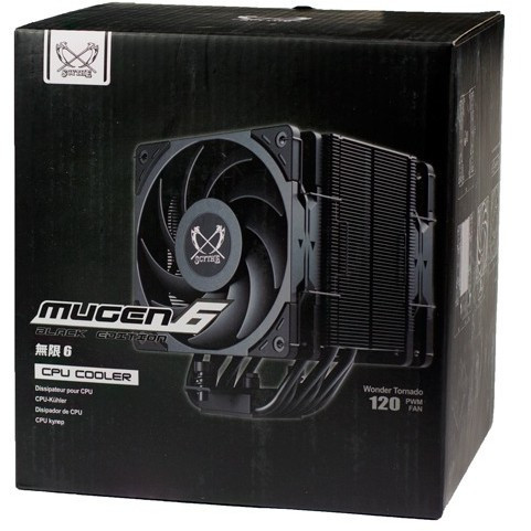 "Scythe Mugen 6 Dual Fan Black Edition. Type: Fan, Fan diameter: 12 cm, Rotational speed (min): 300 RPM, Rotational speed (max): 2000 RPM, Airflow: 102.44 m³/h, Minimum air pressure: 0.05 mmH2O, Maximum air pressure: 2.45 mmH2O. Voltage: 12 V. Width: 132 mm, Depth: 132 mm, Height: 154 mm. Product colour: Black"\n"The Mugen 6 Dual Fan Black Edition introduces a redesigned heatsink with a sleek black finish. The special e-coating ensures unrestricted cooling performance without compromise. For active cooling, two Wonder Tornado 120mm fans are used in a push-pull configuration, taking full advantage of the updated design features.