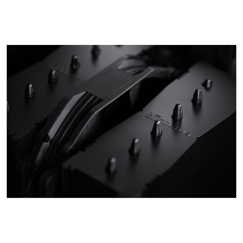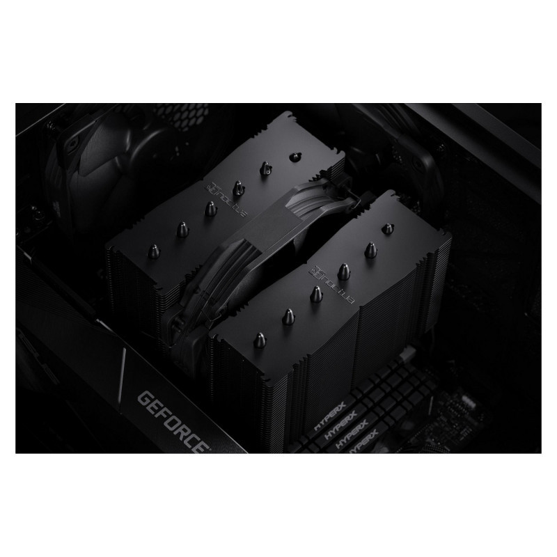 "Noctua NH-D15S chromax.black. Type: Cooler, Fan diameter: 14 cm, Rotational speed (min): 300 RPM, Rotational speed (max): 1500 RPM, Airflow: 140.2 m³/h, Bearing type: Self-Stabilising Oil-pressure Bearing (SSO). Voltage: 12 V. Width: 150 mm, Depth: 135 mm, Height: 160 mm. Product colour: Black"\n"The NH-D15S chromax.black is an all-black version of Noctua’s award-winning NH-D15S premium-quality quiet CPU cooler. Thanks to the same asymmetrical dual-tower heatsink design and single NF-A15 PWM fan, it stays true to the NH-D15S’s successful formula of fusing dual-tower performance with excellent RAM, case and PCIe compatibility. At the same time, the chromax.black version with its black fan and black coated heatsink combines these assets with a sleek stealth look. Topped off with the renowned SecuFirm2™ multi-socket mounting system, Noctua’s enthusiast-grade NT-H1 thermal compound and a full 6-year manufacturer’s warranty, the NH-D15S chromax.black is a premium choice for customers who seek a highly compatible dual-tower heatsink that looks just as great as it cools."
