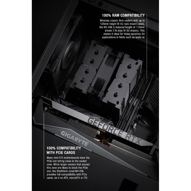 Many Intel LGA115x based mini-ITX mainboards have the PCIe slot sitting right next to the 95x95mm socket zone. While larger coolers that exceed this zone are likely to block the PCIe slot, the 95x95xmm sized NH-D9L provides full compatibility with PCIe cards, be it on ATX, microATX or ITX.