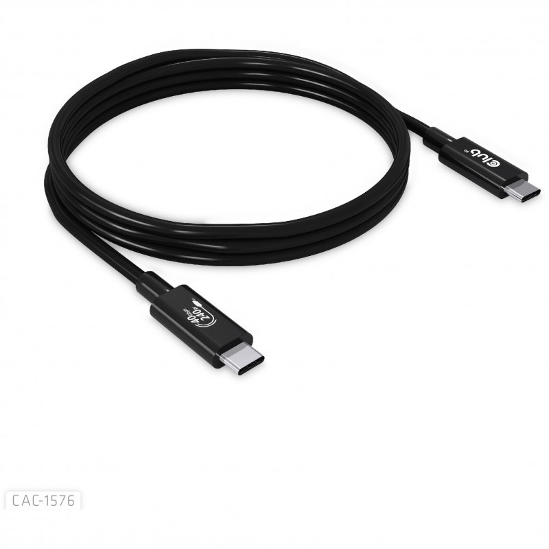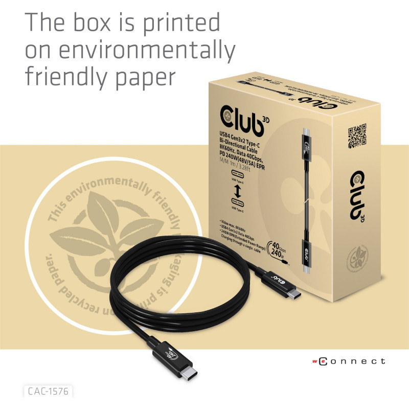 "CLUB3D USB4 Gen3x2 Type-C Bi-Directional Cable 8K60Hz, Data 40Gbps, PD 240W(48V/5A) EPR M/M 1m / 3.28ft. Cable length: 1 m. Connector 1: USB C, Connector 2: USB C, USB version: USB4 Gen 3x2, Maximum data transfer rate: 40 Gbit/s, Product colour: Black"\n"The Club 3D CAC-1576 USB4 Gen3x2 Type-C Bi-Directional USB-IF Certified Cable 8K60Hz, Data 40Gbps, PD 240W(48V/5A) EPR M/M 1m / 3.28ft connects your Notebook, Tablet or Phone with USB4 Type-C output to your favorite existing Peripherals, Accessories and Chargers. It enables Video,Data and Power over a single cable and both ways. This cable supports USB4 Gen3x2 Type-C Bi-Directional Video 8K60Hz, Data 40Gbps, PD 240W(48V/5A) EPR M/M 1m / 3.28ft output for Downstream charging or powering your Notebook, Tablet or Smartphone and is USB-IF Certified."