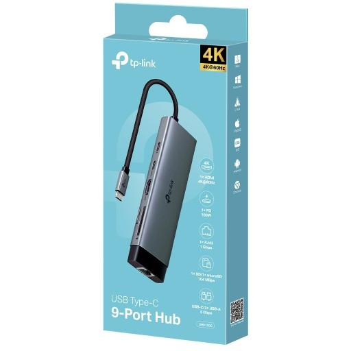 "TP-Link UH9120C. Host interface: USB 3.2 Gen 1 (3.1 Gen 1) Type-C, Hub interfaces: HDMI, RJ-45, USB 3.2 Gen 1 (3.1 Gen 1) Type-A, USB 3.2 Gen 1 (3.1 Gen 1) Type-C, Compatible memory cards: MicroSD (TransFlash), SD. Data transfer rate: 5000 Mbit/s, Certification: CE, FCC, RoHS, HDMI, BSMI. Other operating systems supported: Android, ChromeOS, iOS. Width: 140.2 mm, Depth: 43 mm, Height: 14.3 mm"\n"Compact and Elegant Design