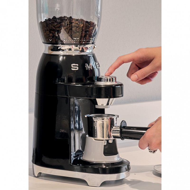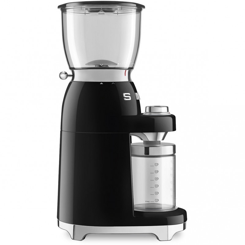 "Smeg 50's Style Coffee Grinder CGF11BLEU Black. Product type: Burr grinder, Coffee beans capacity: 350 g, Burr type: Conical burr. Power: 150 W, AC input voltage: 220-240 V, AC input frequency: 50-60 Hz. Weight: 3.1 kg, Width: 170 mm, Depth: 250 mm. Package width: 275 mm, Package depth: 195 mm, Package height: 495 mm. Accessories included: Powder container support, Centering filter support:"\n"There are numerous methods for making an excellent coffee-based drink at home, but true connoisseurs understand that regardless of the extraction method used, the coffee beans must be freshly ground. The aroma and flavour of freshly ground coffee are far more intense than those of ready-ground coffee.