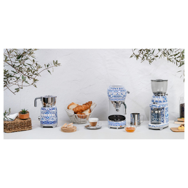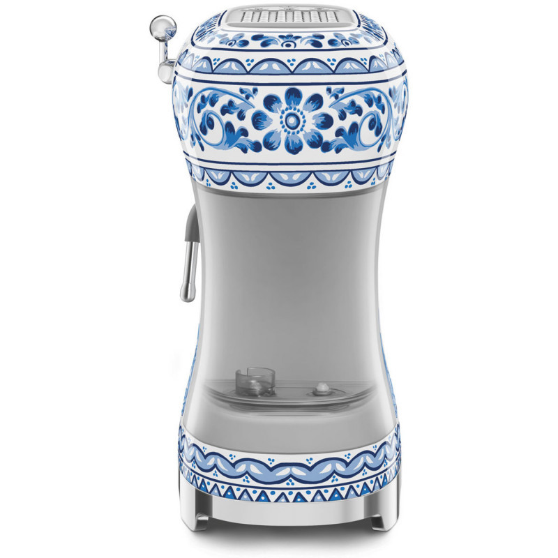 "Smeg 50's Style Espresso Coffee Machine ECF02DGBUK Decorated / Special. Product type: Espresso machine, Coffee maker type: Semi-auto, Water tank capacity: 1.1 L, Reservoir for brewed coffee: Cup, Capacity in cups: 1 cups. Power: 1350 W. Product colour: Blue"\n"Made in Italy production and design