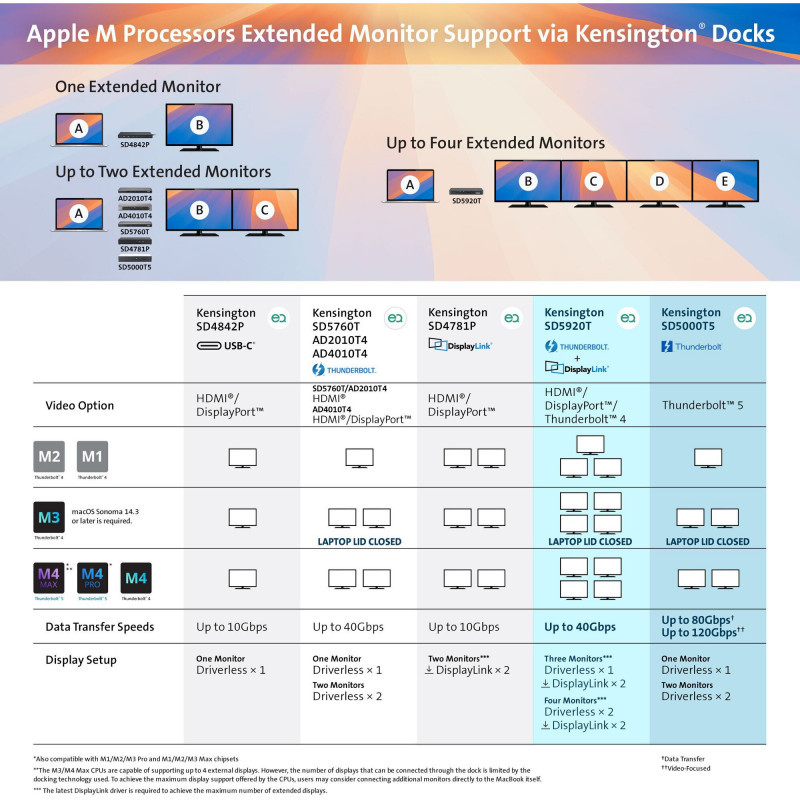 "Kensington SD4781P EQ USB-C & USB-A Dual 4K Docking Station. Connectivity technology: Wired, Host interface: USB 3.2 Gen 2 (3.1 Gen 2) Type-C, USB Power Delivery up to: 100 W. Ethernet LAN data rates: 10,1000 Mbit/s. Product colour: Black, Data transfer rate: 10 Gbit/s, HD type: 4K Ultra HD. Power source type: DC, AC input voltage: 100 - 240 V, Input current: 1.8 A. Other operating systems supported: ChromeOS"\n"Ideal for professionals requiring a single docking solution for a mixed estate of devices and organisations putting sustainability at the forefront, the SD4781P EQ USB-C® & USB-A Dual 4K Docking Station is a versatile dock that supports the latest USB-C® and legacy USB-A* laptops - including dual monitor support for MacBook M1/M2/M3 laptops.