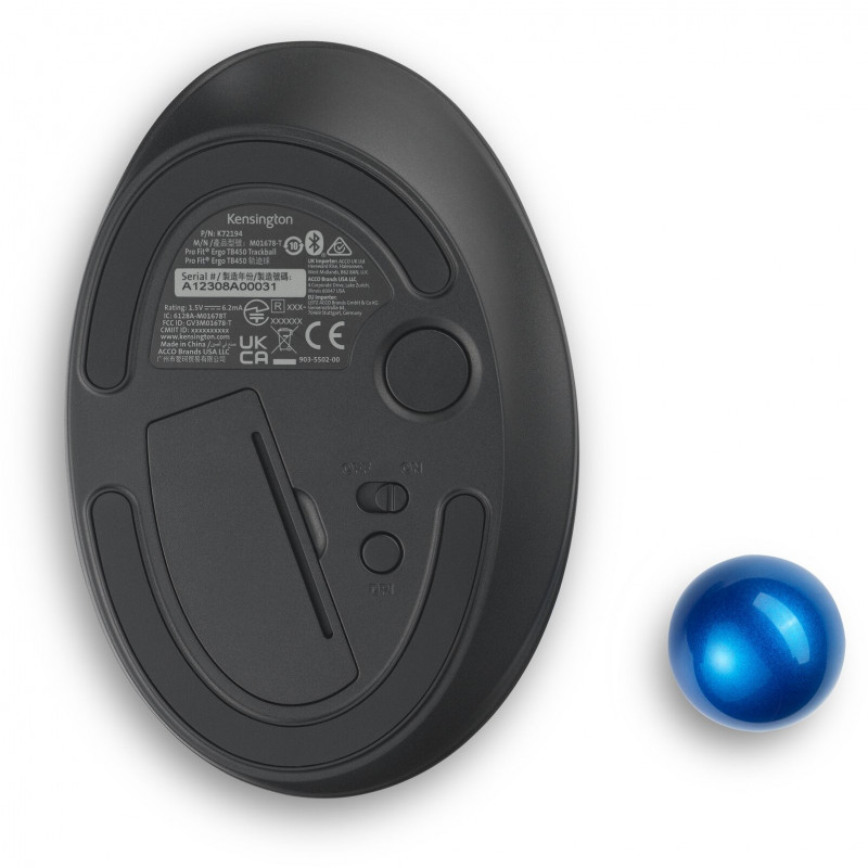 "Kensington Pro Fit Ergo TB450 Trackball. Form factor: Right-hand. Movement detection technology: Trackball, Device interface: RF Wireless + Bluetooth, Movement resolution: 1600 DPI, Buttons type: Pressed buttons, Buttons quantity: 7, Scroll type: Trackball/Wheel. Power source: Batteries. Product colour: Black, Blue"\n"Whether you’re working from home, the office or on-the-go, today’s users seek device solutions that prioritise both comfort and productivity, whilst keeping sustainability at the forefront.