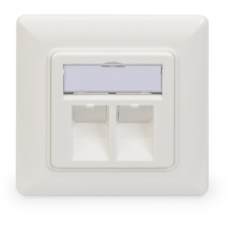 "Digitus Wallplate for Keystone Modules, German type, middle plate 50x50 mm, frame 80x80 mm. Socket type: RJ-45. Product colour: White. Width: 80 mm, Depth: 5 mm, Height: 80 mm. Country of origin: China"\n"Future-oriented standards and high-end quality for your network.