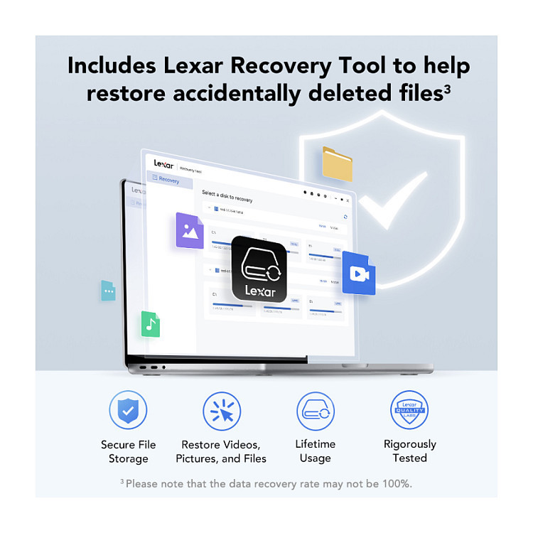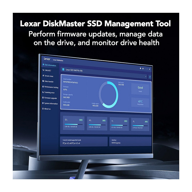 The drive comes with the Lexar DiskMaster SSD Management tool, which allows you to easily perform firmware updates that enhance the drive’s reliability, manage the data on the drive such as securely erasing private files, and monitor the drive’s health for timely detection of potential issues.