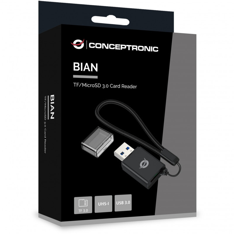 "Conceptronic BIAN07B TF/MicroSD 3.0 Card Reader, UHS-I, USB 3.0, 5Gbps. Compatible memory cards: MicroSD (TransFlash), MicroSDHC, MicroSDXC, Product colour: Black, Data transfer rate: 5000 Mbit/s. Interface: USB 3.2 Gen 1 (3.1 Gen 1) Type-A. Width: 21 mm, Depth: 8 mm, Height: 44.5 mm. Quantity per pack: 1 pc(s), Package width: 75 mm, Package depth: 25 mm. Windows operating systems supported: Windows 10, Windows 10 Education, Windows 10 Education x64, Windows 10 Enterprise, Windows 10..., Mac operating systems supported: Mac OS X 10.10 Yosemite, Mac OS X 10.11 El Capitan, Mac OS X 10.12 Sierra, Mac OS X 10.13 High..., Mobile operating systems supported: Android 10.0, Android 11.0, Android 12.0, Android 13.0, Android 5.0, Android 5.1, Android 6.0,..."\n"The TF/MicroSD 3.0 Card Reader provides reliable and efficient data transmission, supporting TF 3.0 and UHS-I with USB 3.0 transfer speeds up to 5Gbps. Its compact design, coupled with the included lanyard, ensures easy portability, making it an ideal companion for travel or everyday use."