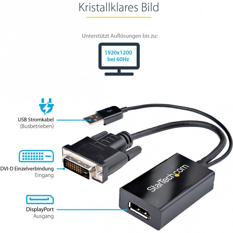 "StarTech.com DVI to DisplayPort Adapter - USB Power - 1920 x 1200 - DVI to DisplayPort Converter - Video Adapter - DVI-D to DP. Cable length: 0.254 m, Connector 1: DVI-D, Connector 2: DisplayPort. Compliance certificates: CE, RoHS, Certification: CE, FCC, RoHS. Weight: 25 g, Width: 35 mm, Depth: 58 mm. Package width: 34 mm, Package depth: 254 mm, Package height: 17 mm. Quantity per pack: 1 pc(s)"\n"Use this DVI to DisplayPort converter to connect your DVI computer to a DisplayPort monitor or projector