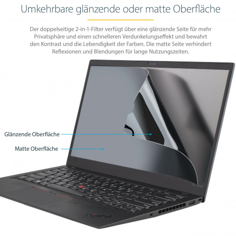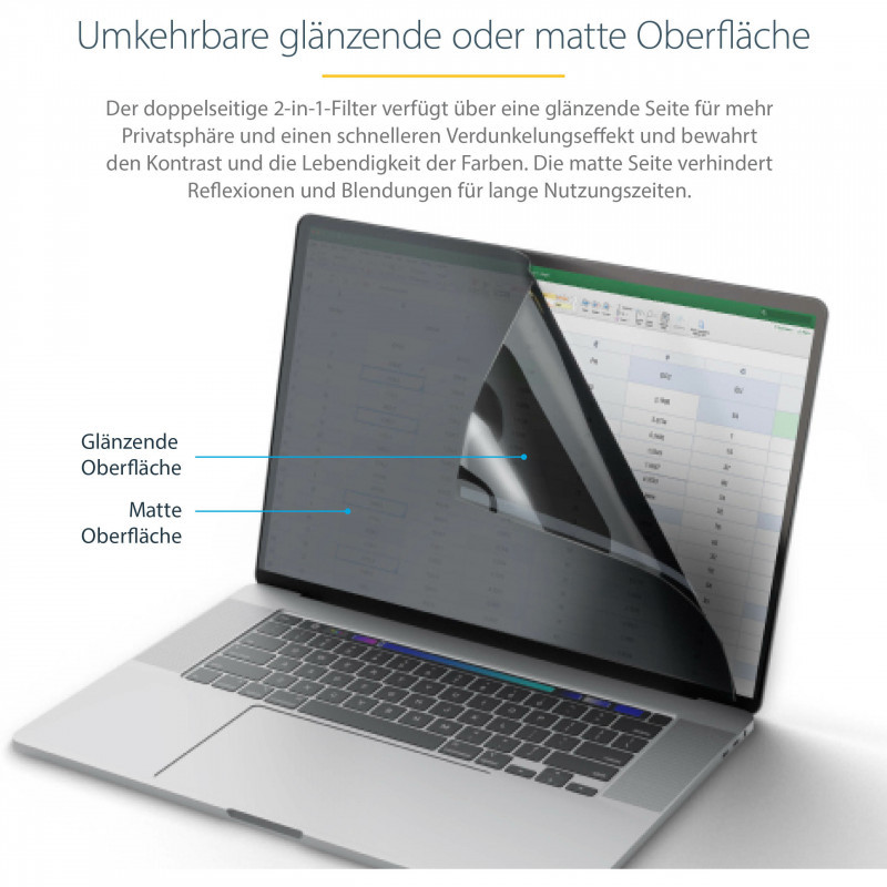 "StarTech.com 14-inch MacBook Pro 21/23 Laptop Privacy Screen, Anti-Glare Privacy Filter with 51% Blue Light Reduction, Monitor Screen Protector with +/- 30 deg. Viewing Angle, Reversible Matte/Glossy Sides. Maximum screen size: 35.6 cm (14""), Suitable for: Laptop, Type: Frameless display privacy filter. Surface finish: Glossy / Matt, Light transmission: 60%, Limits viewing angle: 30°. Weight: 45 g"\n"Prevent visual eavesdropping by limiting the viewing angles of your 14"" MacBook Pro screen