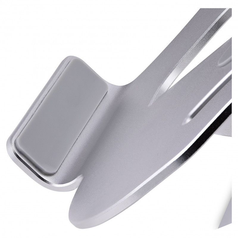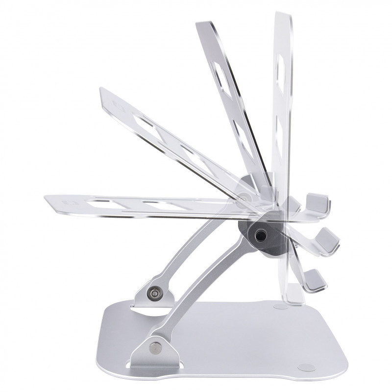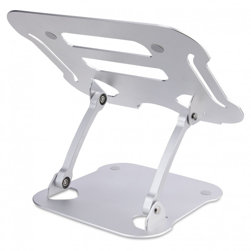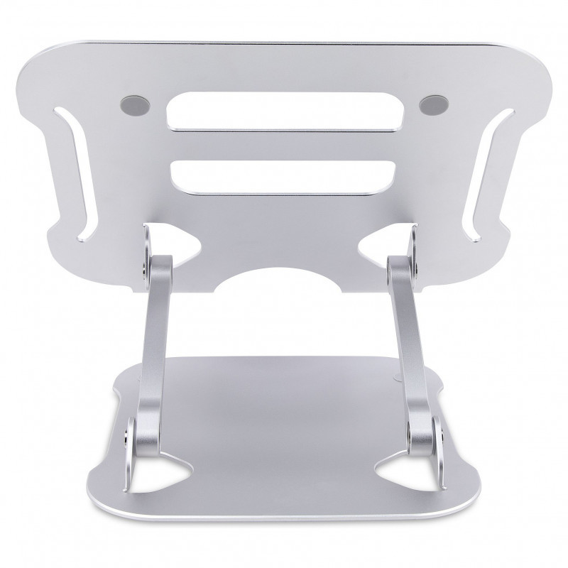 The laptop riser features a silver anodized finish with aluminum construction to ensure durability and sturdiness. The vented surface area is elevated to promote passive cooling and airflow. The space underneath the laptop platform can be used to store a keyboard, mouse, and/or other accessories and peripherals when they are not in use.