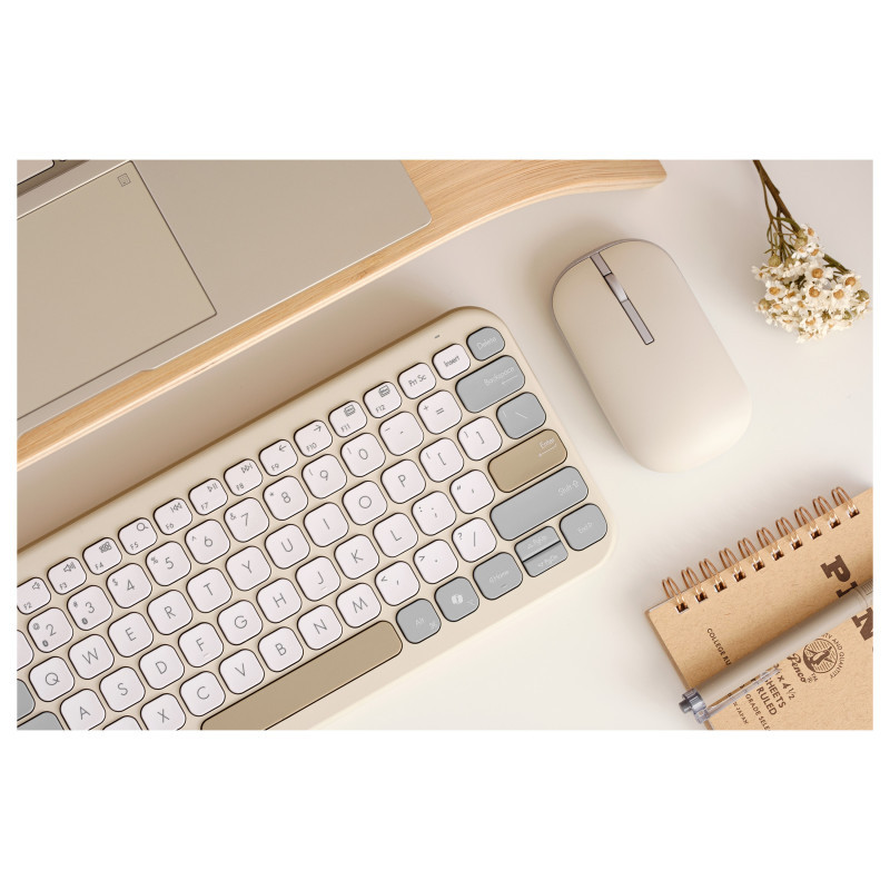 "ASUS Marshmallow Keyboard KW100. Keyboard form factor: 75%. Keyboard style: Straight. Connectivity technology: Wireless, Device interface: Bluetooth, Keyboard key switch: Scissor key switch, Keyboard layout: QWERTZ, Recommended usage: Home. Product colour: Beige, Grey, White"\n"A versatile keyboard, with a touch of color