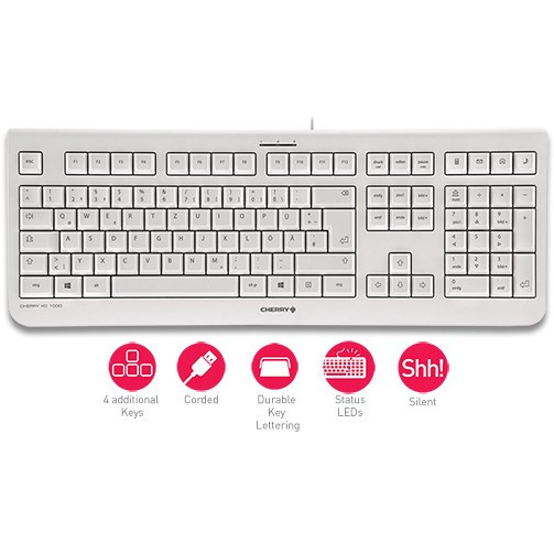 "CHERRY KC 1000. Keyboard form factor: Full-size (100%). Keyboard style: Straight. Connectivity technology: Wired, Device interface: USB, Keyboard number of keys: 109. Cable length: 1.8 m. Recommended usage: Home. Product colour: Grey"\n"CHERRY KC 1000 is rock-solid CHERRY technology with an excellent price/performance ratio. Modern, flat design with gentle, quiet and durable wear-resistant keys. Universal, reliable and optimised for professional use. In black or grey."