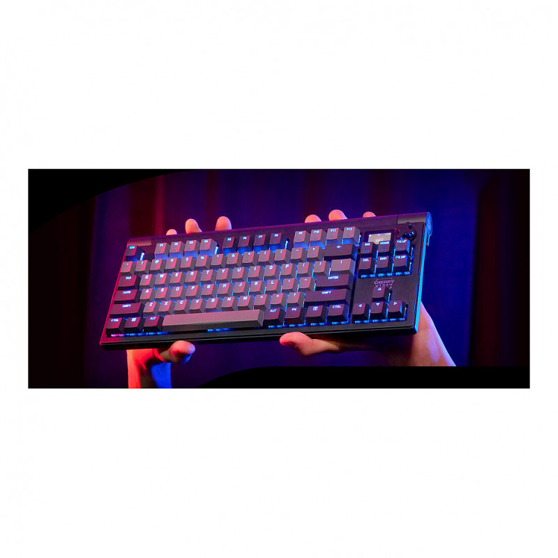 "CHERRY XTRFY MX 8.3 TKL Wireless. Keyboard form factor: Tenkeyless (80 - 87%). Keyboard style: Straight. Connectivity technology: Wired & Wireless, Device interface: USB + RF Wireless + Bluetooth, Keyboard key switch: Mechanical, Keyboard layout: QWERTY. Backlight type: RGB LED. Cable length: 1.8 m. Recommended usage: Gaming. Product colour: Grey"\n"PREMIUM TYPING.