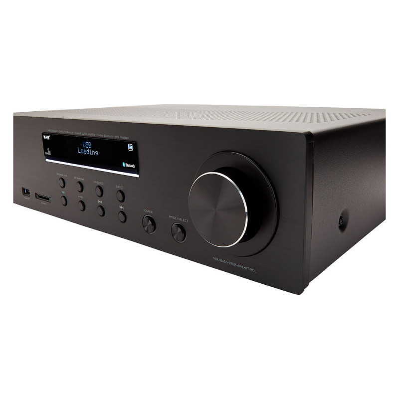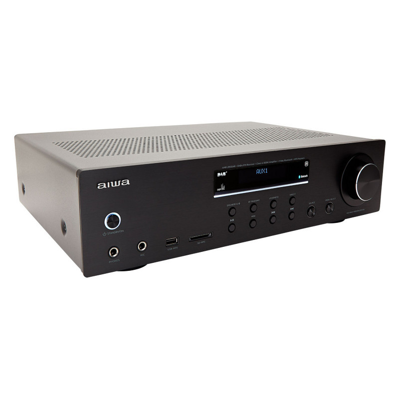 "Aiwa AMR-200DAB/BK. Audio output channels: 2.0 channels, Peak power per channel: 100 W, Total Harmonic Distortion (THD): 0.1%. Speakers connectivity type: RCA, Headphone connectivity: 6.3 mm, Speaker selector: A / B. Power source type: AC. Width: 290 mm, Depth: 100 mm, Height: 430 mm. Package weight: 9.12 kg"\n"The Aiwa AMR-200DAB/BK delivers 200W of powerful, clear sound (2x 100W RMS @4 Ohms, 0.1% THD). Key features include a phono input with RIAA EQ, Bluetooth v5.0, DAB+ and FM-RDS radio, and customizable sound settings. Enjoy versatile connectivity with multiple audio inputs and gold-plated speaker terminals. Perfect for audiophiles seeking superior audio quality."