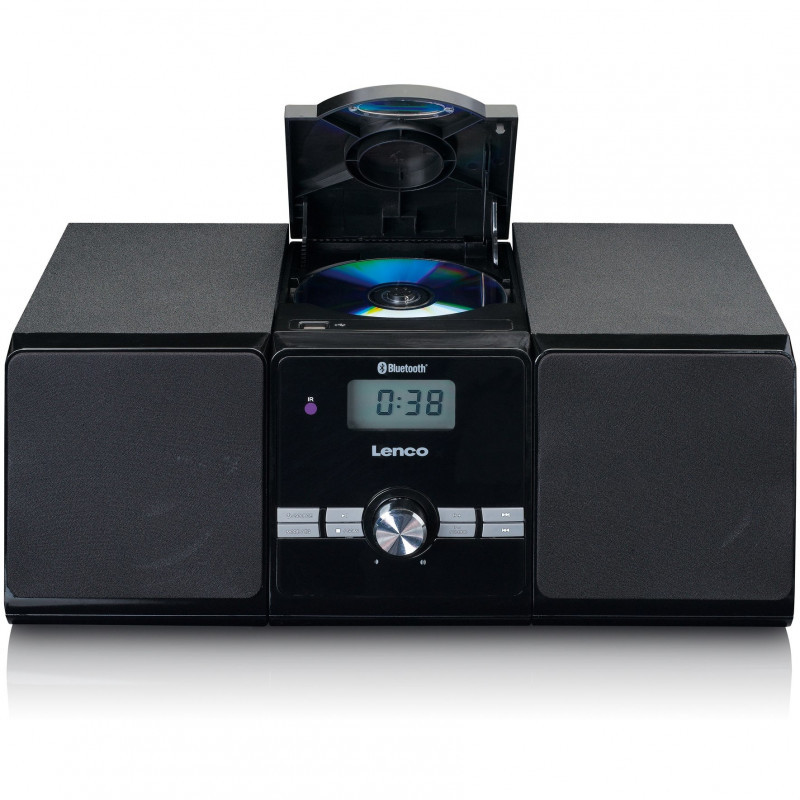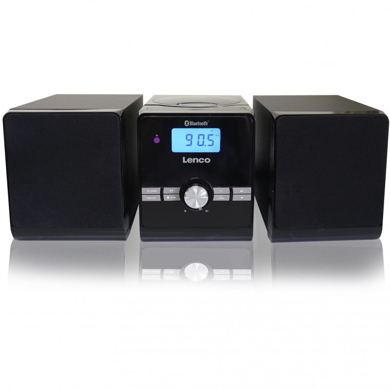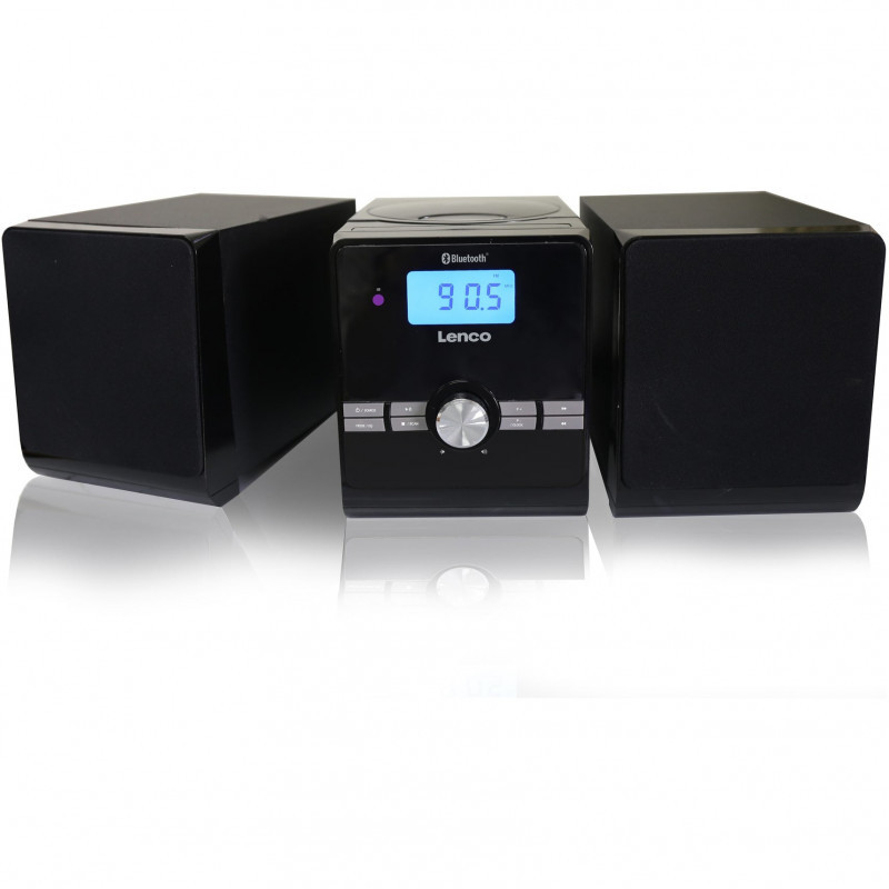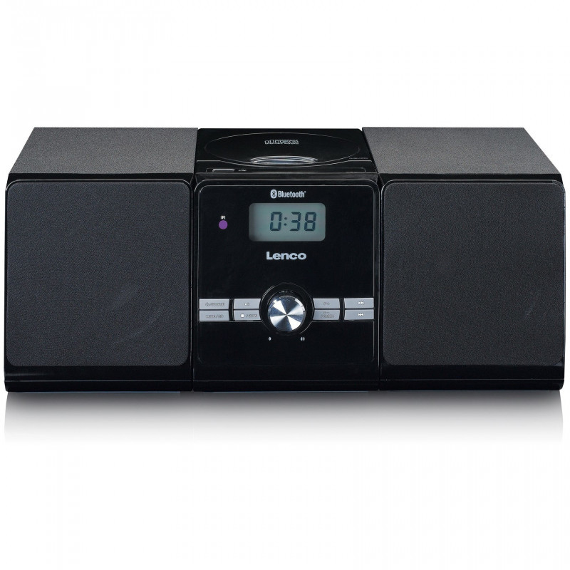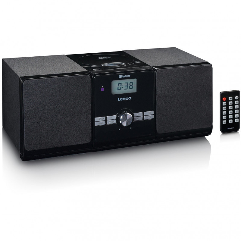 "Lenco MC-030BK. Type: Home audio micro system, Product colour: Black, Number of optical discs: 1 discs. RMS rated power: 10 W. Supported radio bands: FM, RDS features: PLL, FM band range: 87.5 - 108 MHz. Display type: LCD, Backlight colour: Blue. Bluetooth range: 10 m"\n"The Lenco MC-030BK microsystem is a complete hi-fi set with 2 wooden speakers and a built-in amplifier. Both speakers have a power of 5W RMS which allows you to listen to a room filled with the sound of your favourite music while you operate it from the sofa via the remote control.