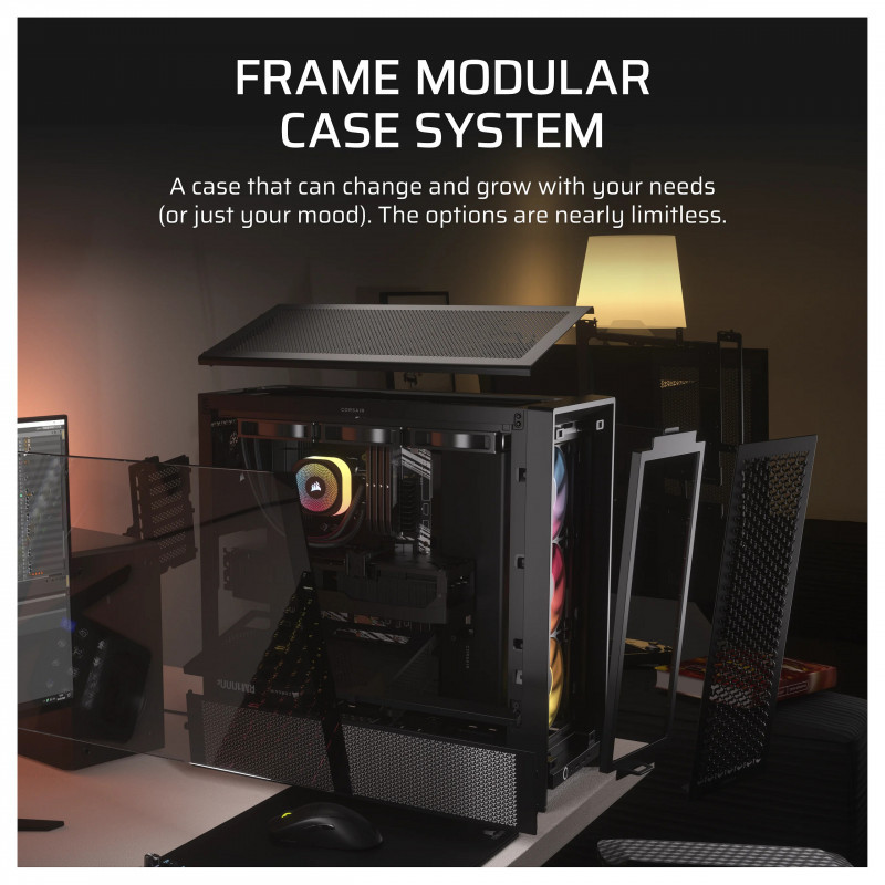 "Corsair FRAME 4000D RS ARGB. Form factor: Midi Tower, Type: PC, Product colour: Black. Supported power supply form factors: ATX. Front fans installed: 3x 120 mm, Front fans diameters supported: 120,140,200 mm, Side fans diameters supported: 120,140 mm. Supported HDD sizes: 2.5,3.5"", SSD form factor: 2.5"". Width: 239 mm, Depth: 490 mm, Height: 486 mm"\n"GET READY FOR YOUR NEXT BUILD