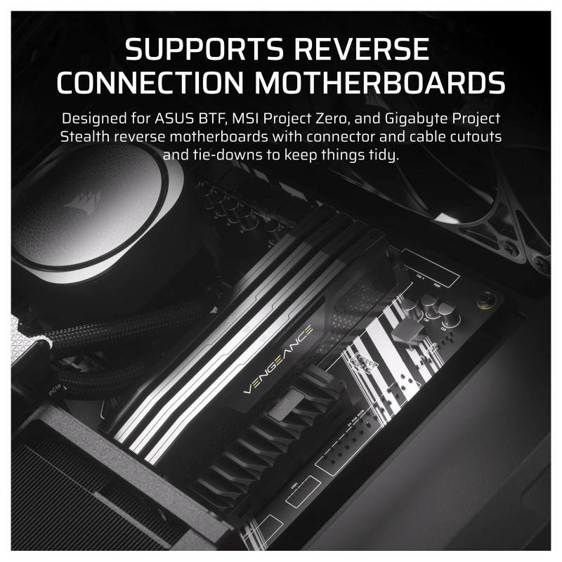 Fully compatible with reverse-connector motherboards from Asus, MSI, and Gigabyte, allowing for unobstructed airflow and a super-clean build.