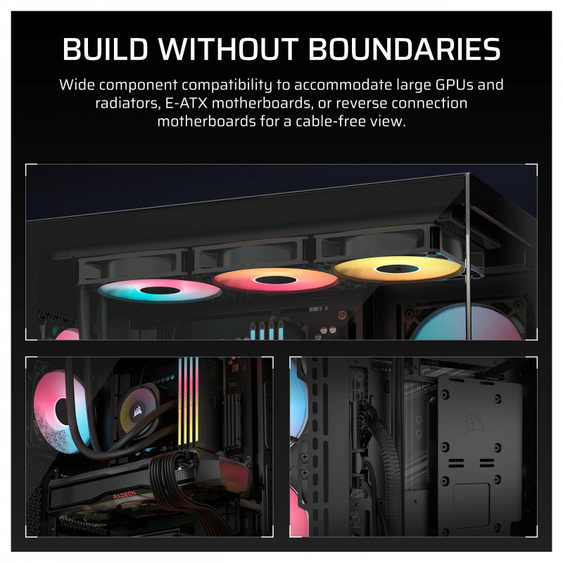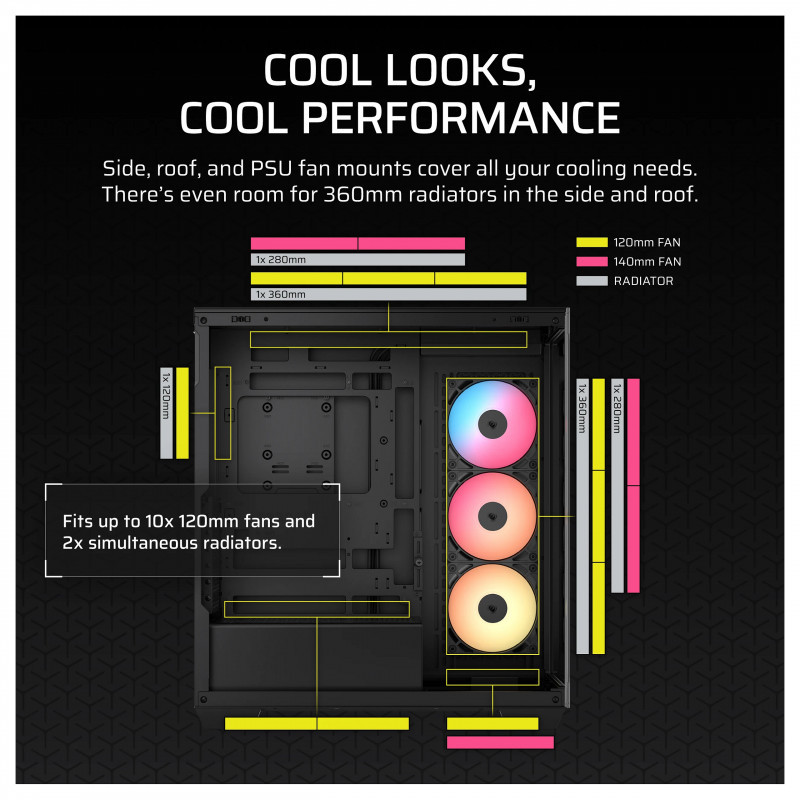 Customize your cooling setup with room for up to 10x 120mm fans, plus versatile radiator mounting options including up to 360mm in the side and roof.