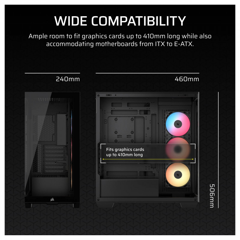 "Corsair 3500X RS-R ARGB. Form factor: Midi Tower, Type: PC, Product colour: Black. Supported power supply form factors: ATX. Side fans installed: 3x 120 mm, Side fans diameters supported: 120,140 mm, Rear fans diameters supported: 120 mm. Supported HDD sizes: 3.5"", SSD form factor: 2.5"". Width: 240 mm, Depth: 460 mm, Height: 506 mm"\n"VERSATILITY BUILT-IN
