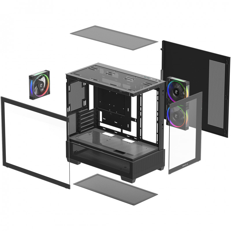 "DeepCool CG380 3F. Form factor: Midi Tower, Type: PC, Product colour: Black. Power supply location: Bottom. Side fans installed: 2x 120 mm, Side fans diameters supported: 120 mm, Rear fans installed: 1x 120 mm. Supported HDD sizes: 2.5,3.5"". Width: 235 mm, Depth: 437 mm, Height: 451 mm"\n