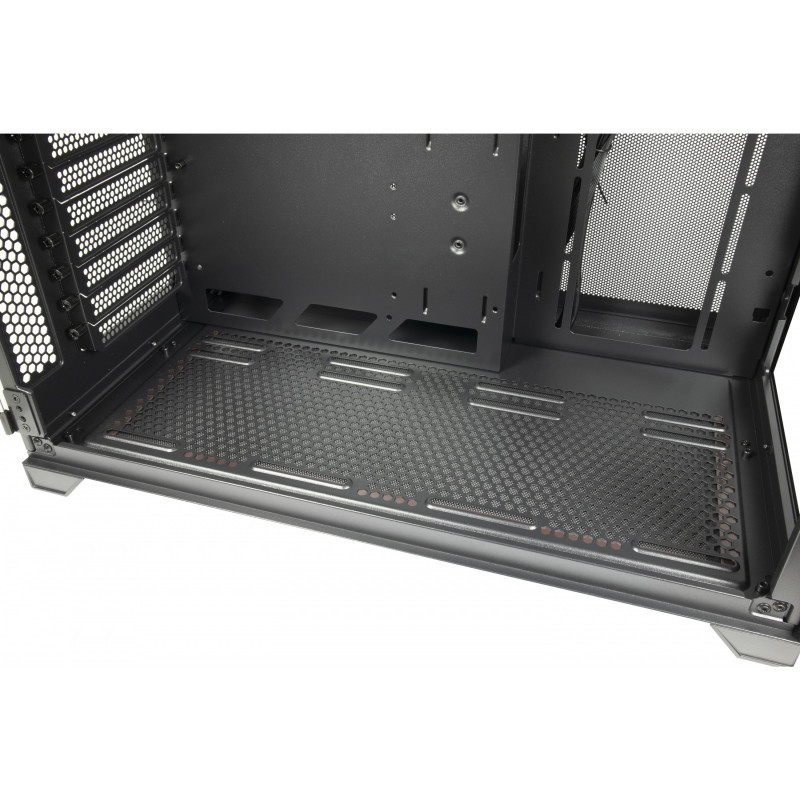 "Inter-Tech C-703 Vision. Form factor: Midi Tower, Type: PC, Product colour: Black. Side fans diameters supported: 120 mm, Rear fans diameters supported: 120 mm, Top fans diameters supported: 120,140 mm. Supported HDD sizes: 2.5,3.5"". Width: 285 mm, Depth: 460 mm, Height: 430 mm. Package weight: 8.56 kg"\n"The C-703 Vision is a perfect Show-Case to set the hardware in scene. Thanks to the large front and side panels made of tempered glass, which can be opened without tools using a magnetic catch, the case offers a great view of the interior - both from the front and from the side. There are 10 installation slots for fans available. These can be equipped with 120mm fan or partially with 140mm fans alternatively or with AiO water cooling in the sizes 120mm, 140mm, 240mm, 280mm or 360mm.
