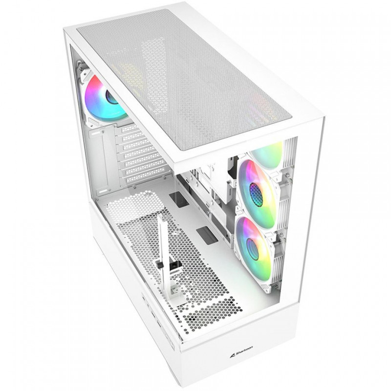 "Sharkoon AK6 RGB. Type: PC, Product colour: White, Supported motherboard form factors: ATX, micro ATX, Mini-ATX. Side fans installed: 3x 120 mm, Side fans diameters supported: 120 mm, Rear fans installed: 1x 120 mm. Supported HDD sizes: 2.5,3.5"". Width: 225 mm, Depth: 435 mm, Height: 485 mm"\n"If you want a stylishly modern glass look for your hardware, then the AK6 RGB is just what you need! This eye-catching ATX case not only puts the focus on the hardware, but also on a good airflow. This is thanks to four pre-installed addressable RGB fans along with a specially designed intake of air through a side panel. In addition, the AK6 RGB is equipped with modern connectivity, broad BTF mainboard compatibility, and plenty of space for components.