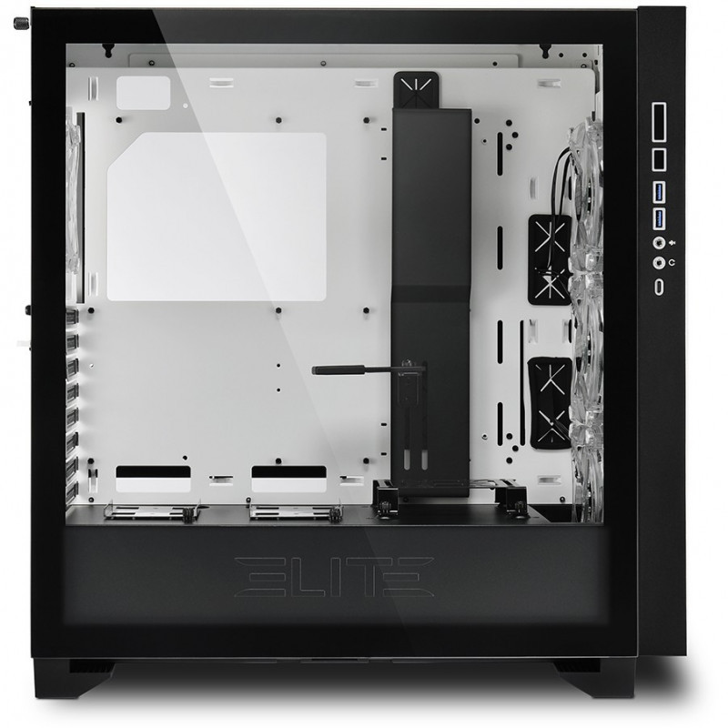 Elite, Steel Appearance. The expressive front panel with its pattern of geometrically designed openings, lends the PC case a futuristic style and makes the CA300T an immediate eye-catcher. In addition, the application of high-quality materials completes the impression of elegance: the top panel has been manufactured with solid metal and the steel front panel is set within a frame made of diamond-cut aluminium. The three RGB-LED fans provide colorful highlights and shine through the pattern of the front panel. An additional RGB LED fan on the rear panel adds more illumination to the inside of the case. Using the software of compatible mainboards containing a pinout of 5V-D-coded-G or 5V-D-G, the RGB LEDs in all the fans can be customized to display unique lighting effects.