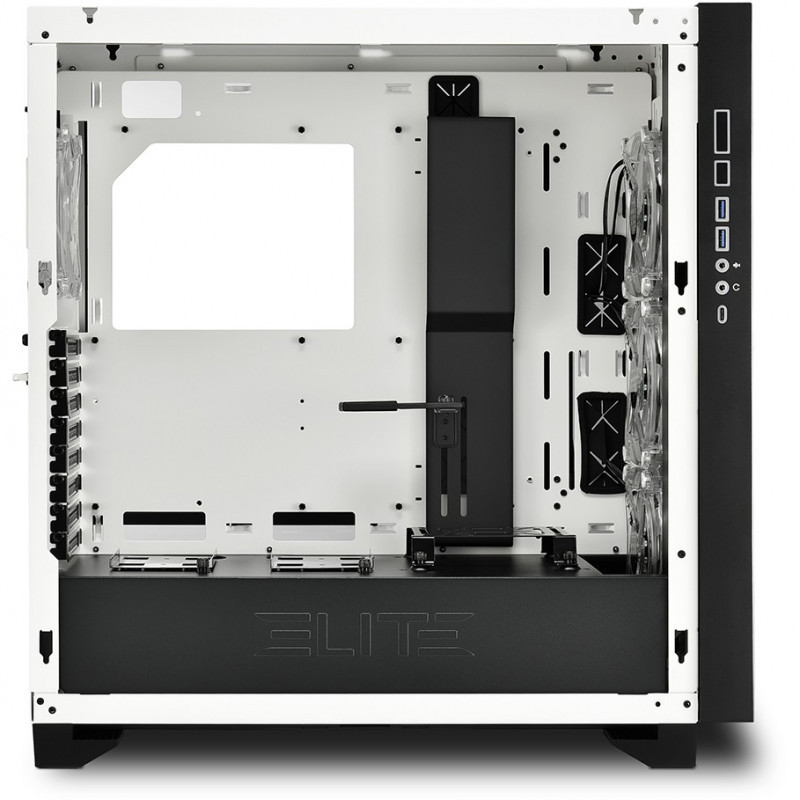 "Sharkoon ELITE SHARK CA300T. Form factor: Tower, Type: PC, Product colour: White. Power supply location: Bottom. Front fans installed: 3x 120 mm, Front fans diameters supported: 120 mm, Rear fans installed: 1x 120 mm. Supported HDD sizes: 2.5,3.5"". Width: 235 mm, Depth: 505 mm, Height: 520 mm"\n"Futuristic front, noble design, and a sophisticated layout – that is the CA300T. The large, sturdy ATX tower from our ELITE SHARK series is aimed at ambitious PC enthusiasts and is equipped with a range novel features. Among these are a side-mounted RGB illuminated I/O panel, two tempered glass side panels, a hinged compartment for cabling as well as a three-layer top panel consisting of a ventilation opening, a magnetically attached dust filter and a perforated top cover. The steel front panel casts an imposing figure with its impressive angular patterns, which is highlighted in front by three highly luminous RGB LED fans. As expected within an ELITE SHARK case, there is also an enormous amount of space inside for powerful hardware and elaborate PC builds.