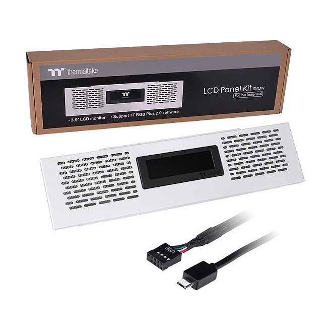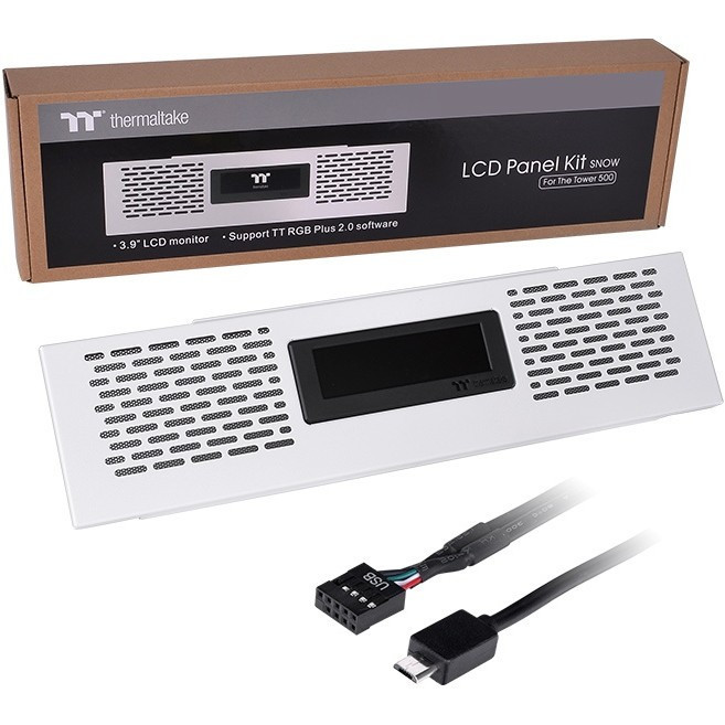 "Thermaltake AC-062-OO6NAN-A1. Compatible chassis type: Midi Tower, Type: LCD panel kit, Product colour: White. Input voltage: 5 V, Power consumption (max): 14 W. Width: 367 mm, Depth: 20.8 mm, Height: 92.2 mm. Quantity per pack: 1 pc(s)"\n"LCD Panel Kit Snow is an exclusive expansion accessory for the Tower 500 chassis. With its 3.9'' LCD display, users can use the TT RGB Plus 2.0 software to gain full control of performance monitoring and personalized effects. Additionally, the LCD Panel Kit Snow can be paired with other Thermaltake Ultra series products, providing the best LCD visual experience.
